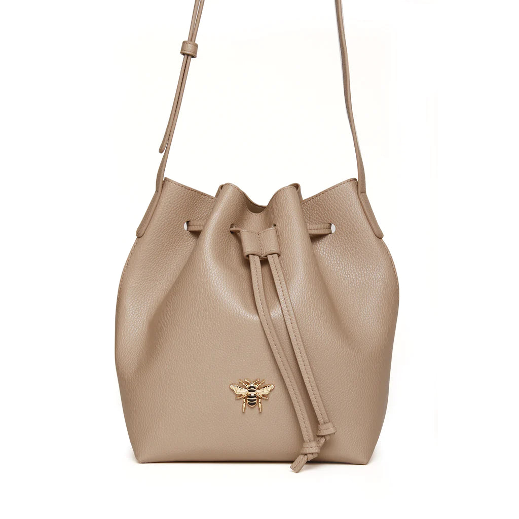 The Bucket Bag features a vegan textured leather finish, a spacious main compartment, and the Alice Wheeler Signature and Honeybee Logo on the front as stylish accents.