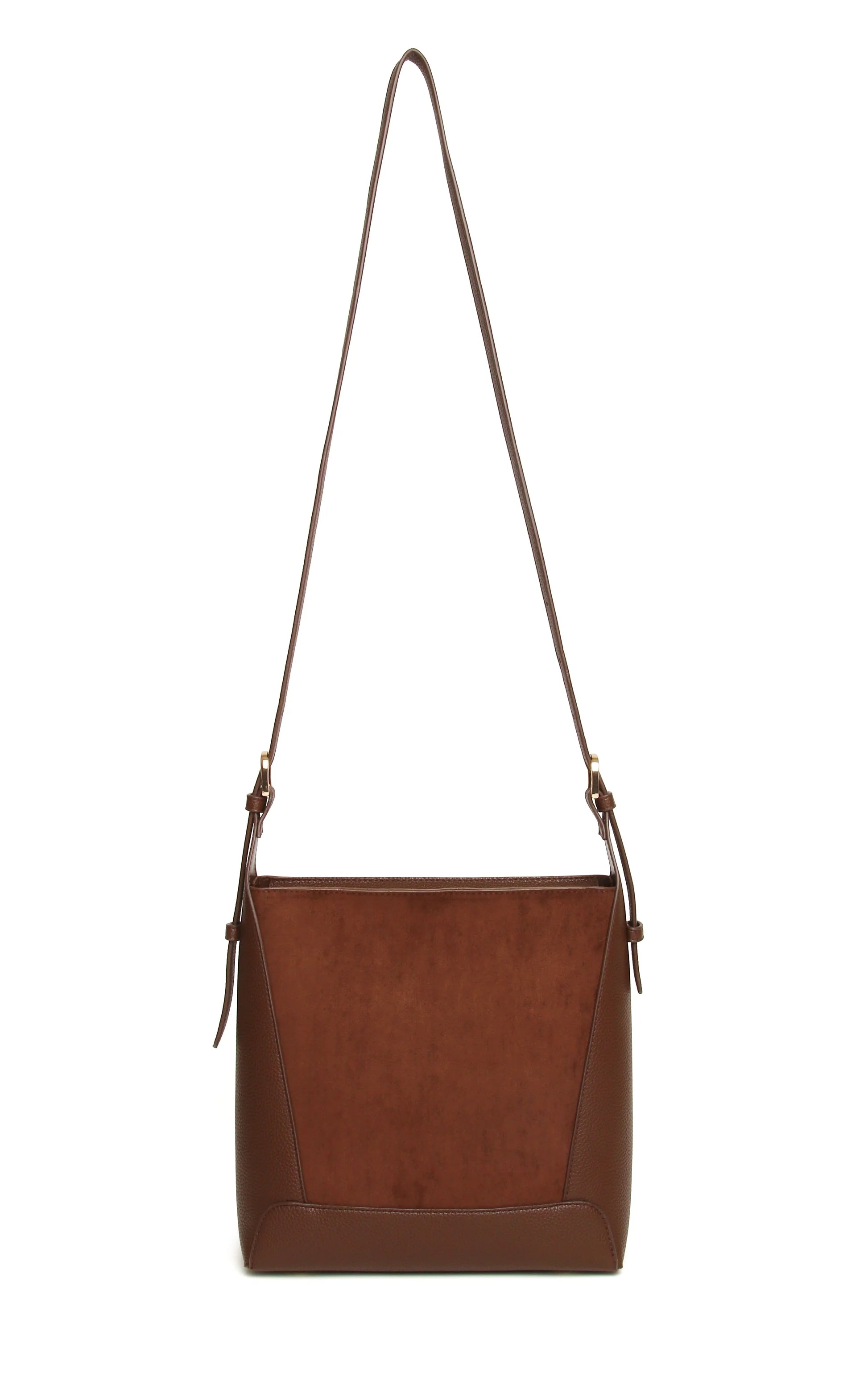 Crafted from a soft suedette finish with smooth vegan leather detailing, this crossbody bag offers a refined yet relaxed silhouette, inspired by modern styling with subtle boho influence. Designed for comfortable all day wear, the adjustable strap allows for hands free crossbody styling while maintaining a sleek, elevated look.