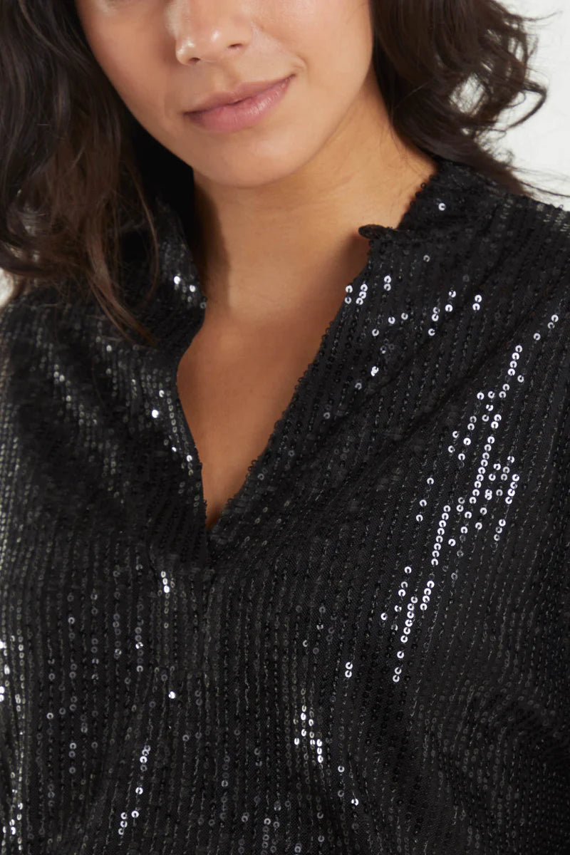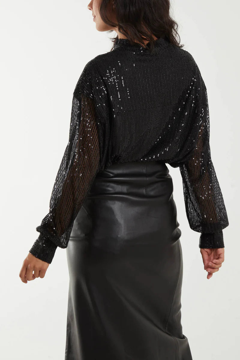 Stay ahead of the fashion curve in this unique collared sequin blouse.