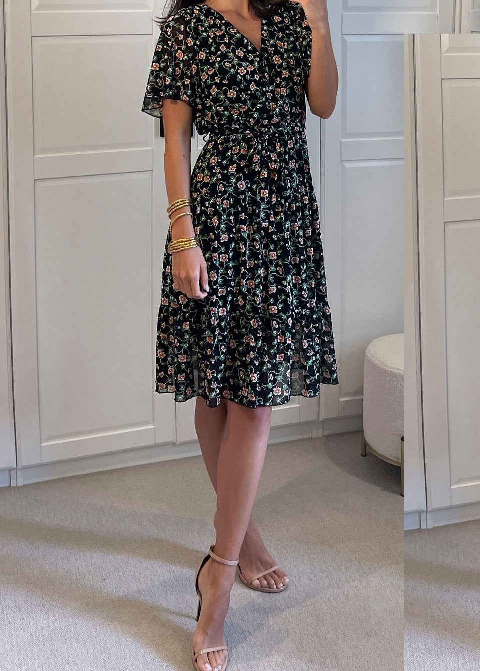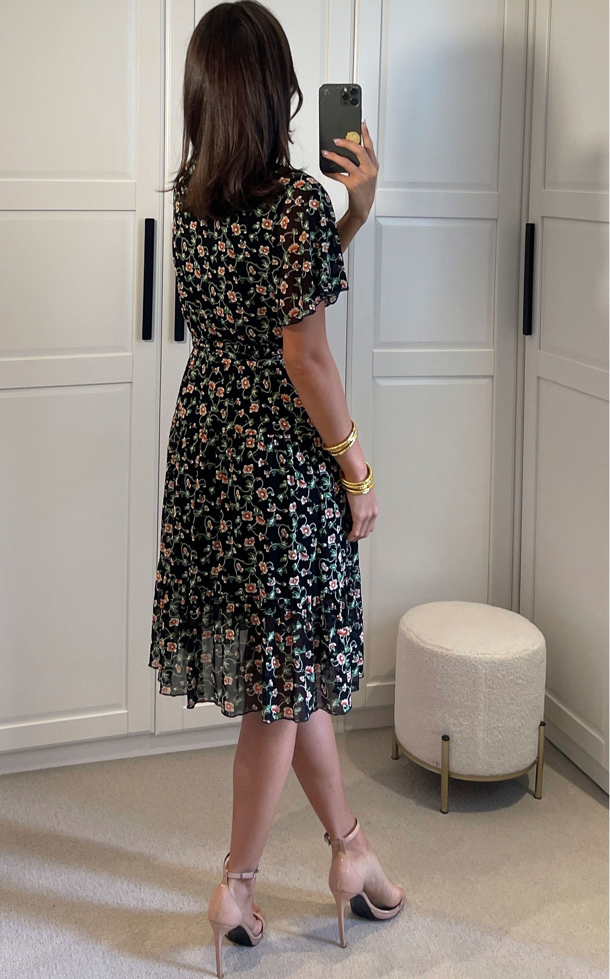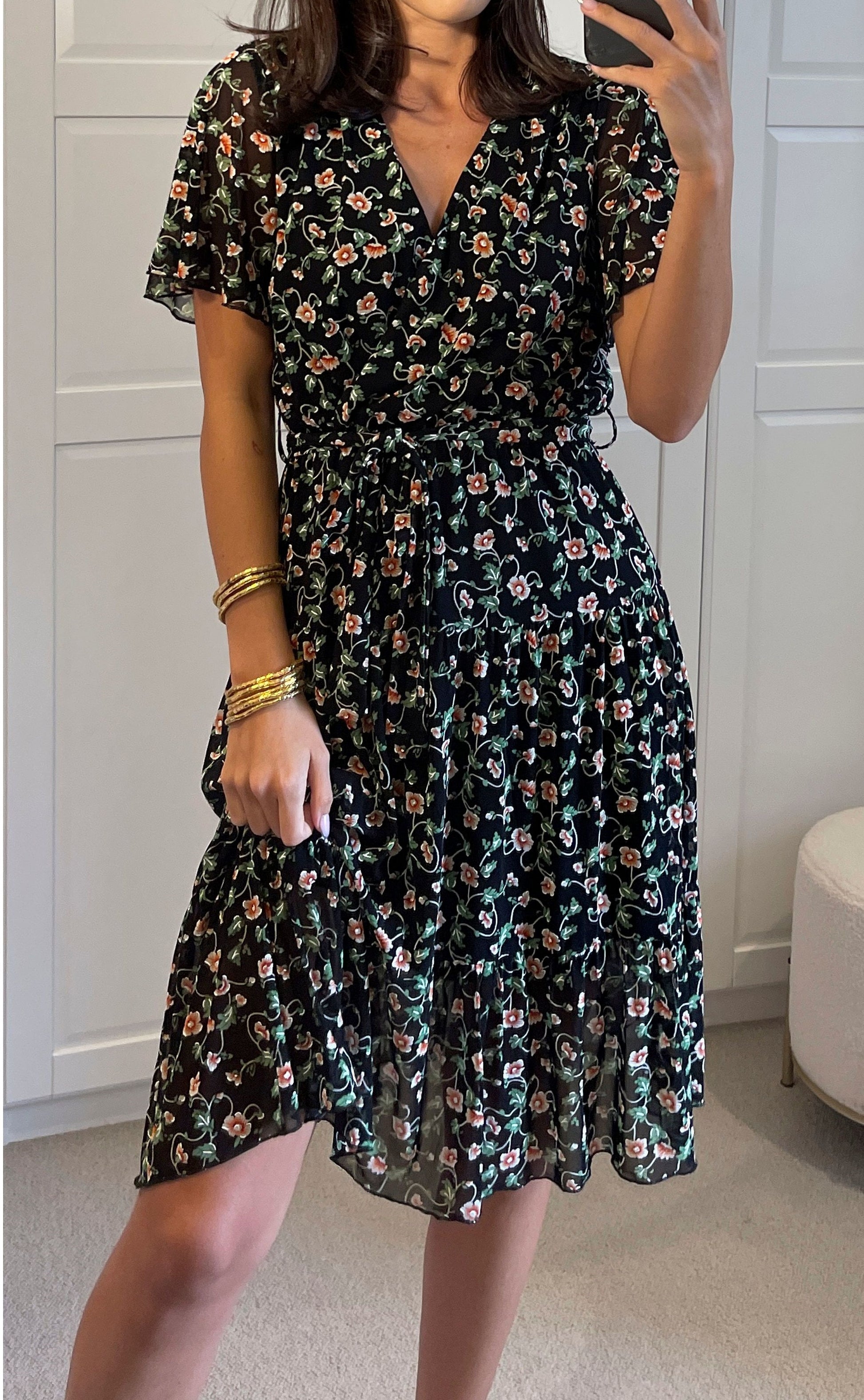 Embrace our Short Sleeve Floral Wrap Midi Dress in Black. With its stunning orange and green floral print and stretchy net fabric, this dress combines style and comfort effortlessly, creating a striking visual appeal.