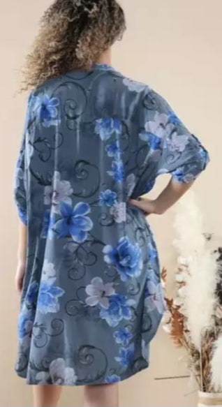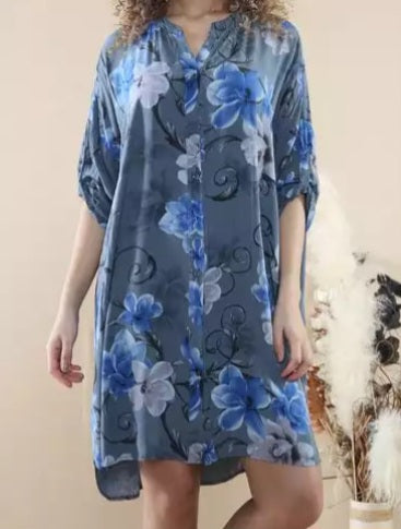 This beautiful floral pattern dress has a button up front and rolled sleeves.