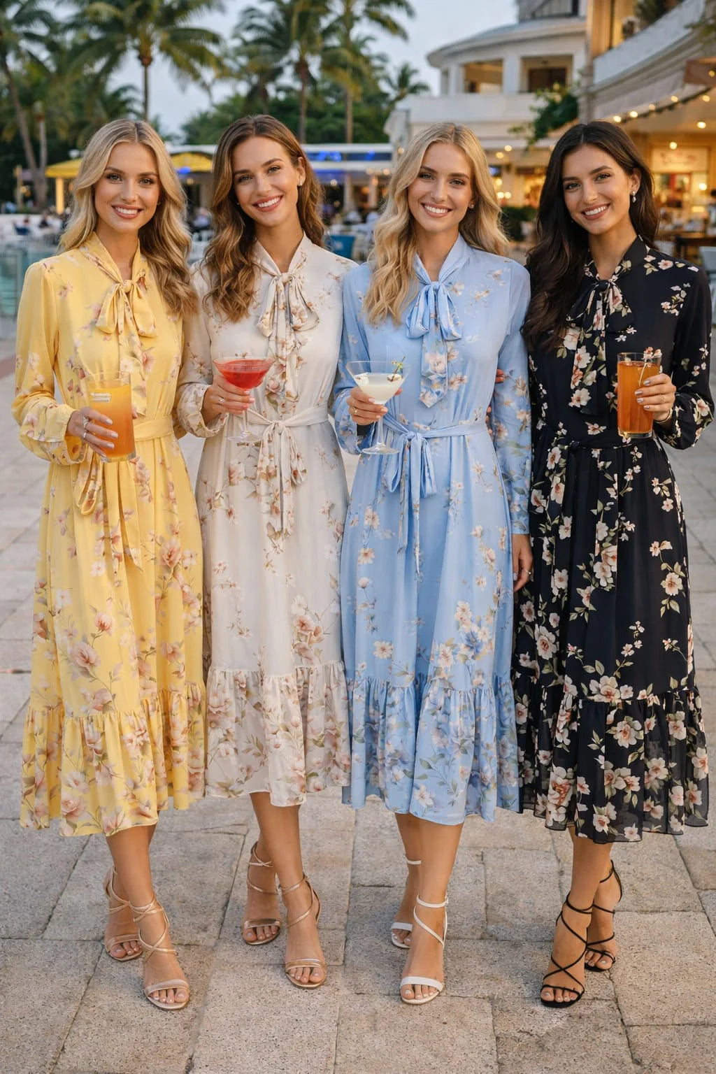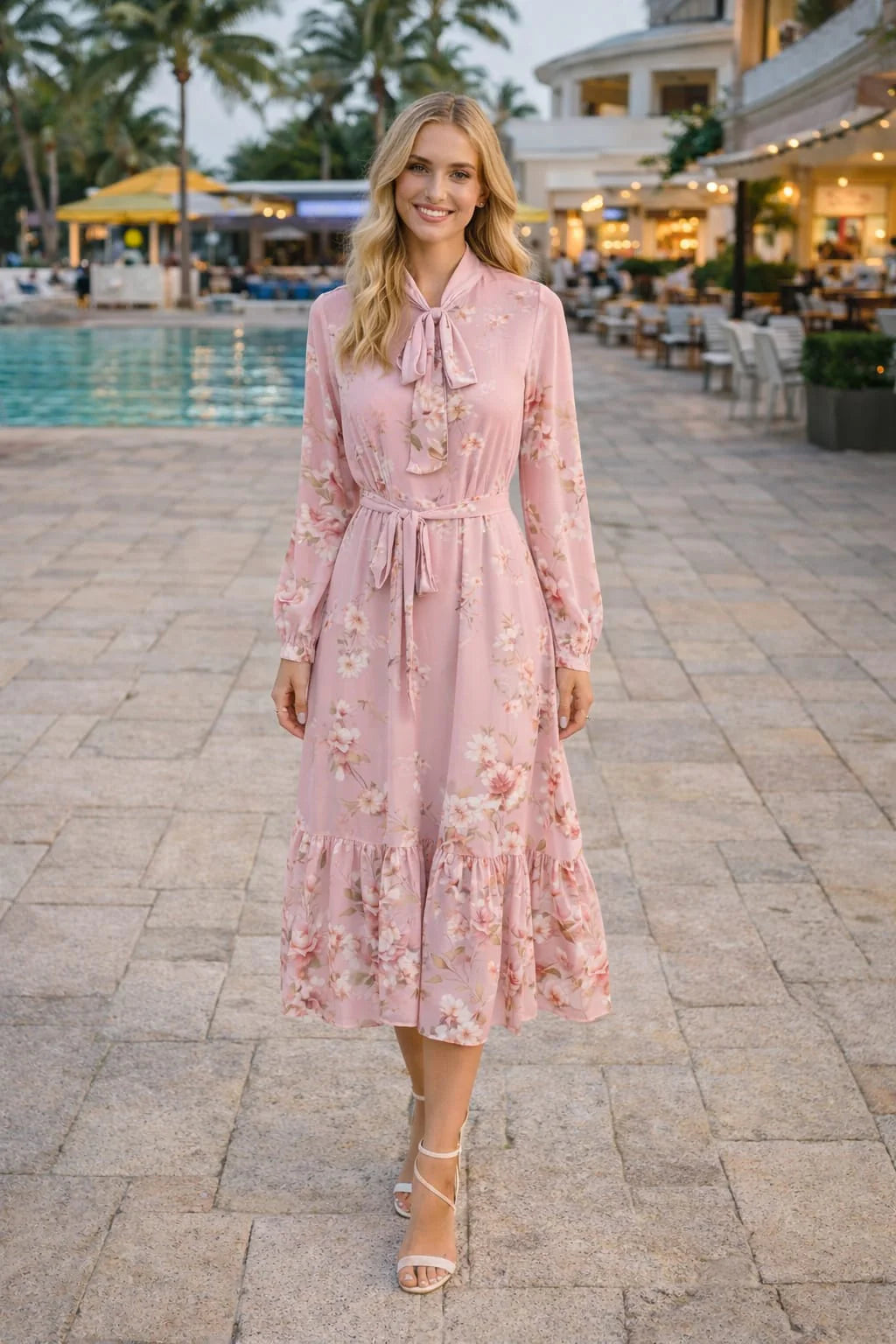Fully lined midi dress with bow tie fastening and blossom print.