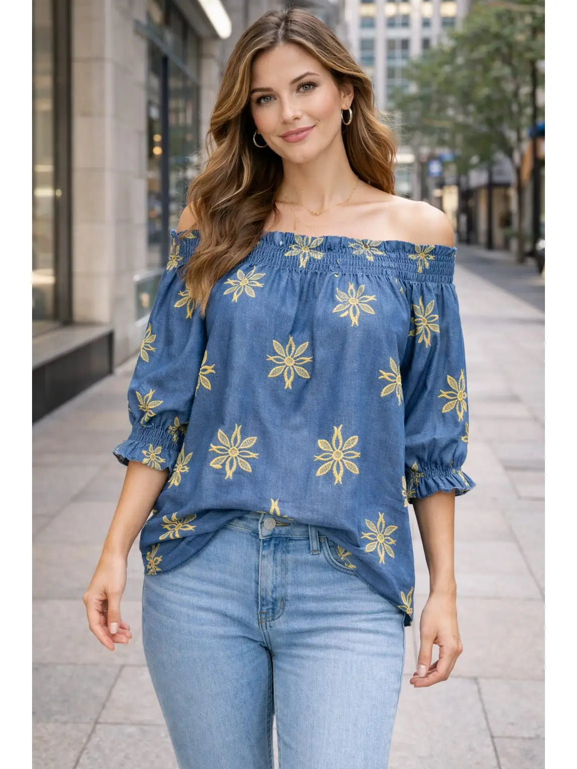 Unique gold embroidery bardot top